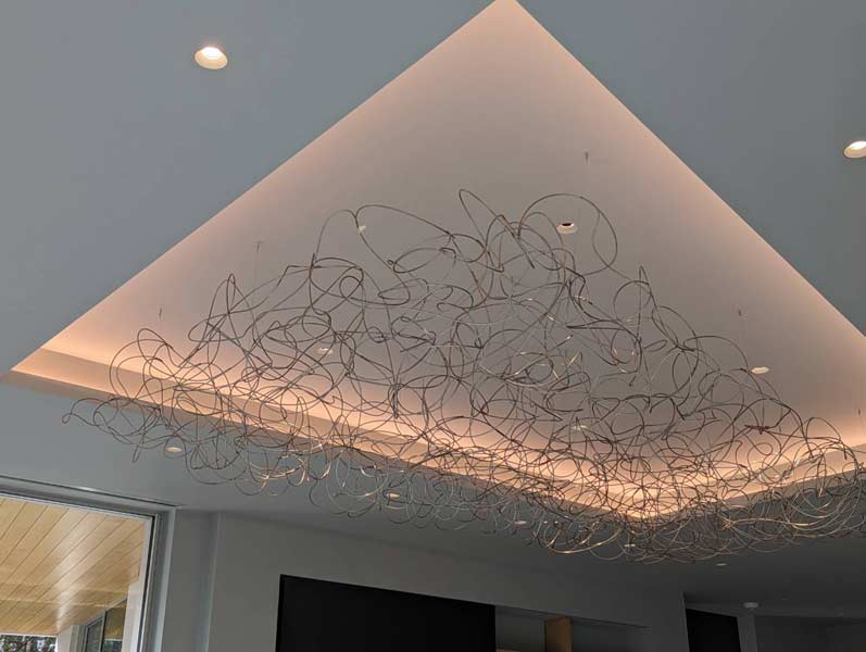 But even without the functional aspects to be concerned with, quality was always top of mind and challenges did arise during the construction of the piece. Constructed of multiple 12-foot pieces of 3/16″ stainless steel rod, the finished piece had multiple welds along its roughly 500 linear feet of continuous stainless steel rod, welds Alec needed to painstakingly plan the placement of to ensure they weren’t visible to anyone looking up at it. The meticulously bent and curved piece took 3 weeks to fabricate as Alec worked tirelessly to ensure that all welds were cleaned and hidden and polished the entire work to a fine satin finish. The finishing touch was to hang this 12 x 8 foot piece by piano wire to complete the floating look the homeowner desired.